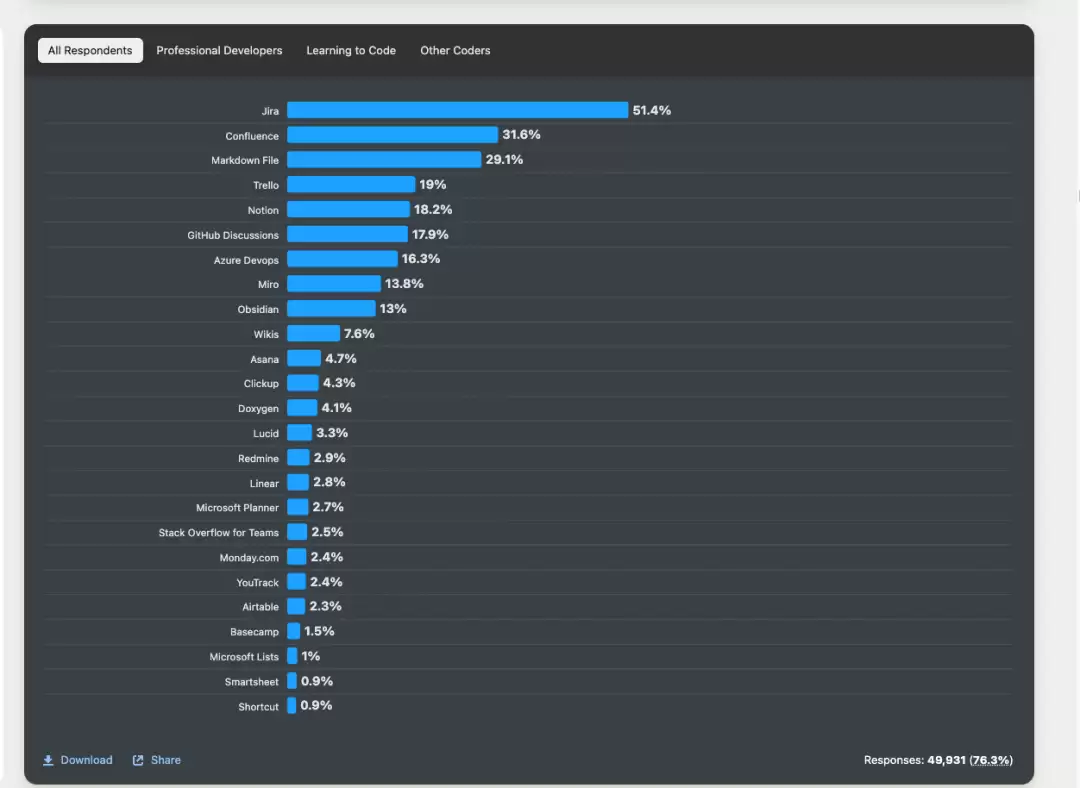Atlassian 账上有 25 亿美元现金,服务数百万企业用户,拥有成熟的销售网络。在 2024 年的 Stack Overflow 开发者调查报告中,前五名中,Atlassian 旗下产品就占了三席。