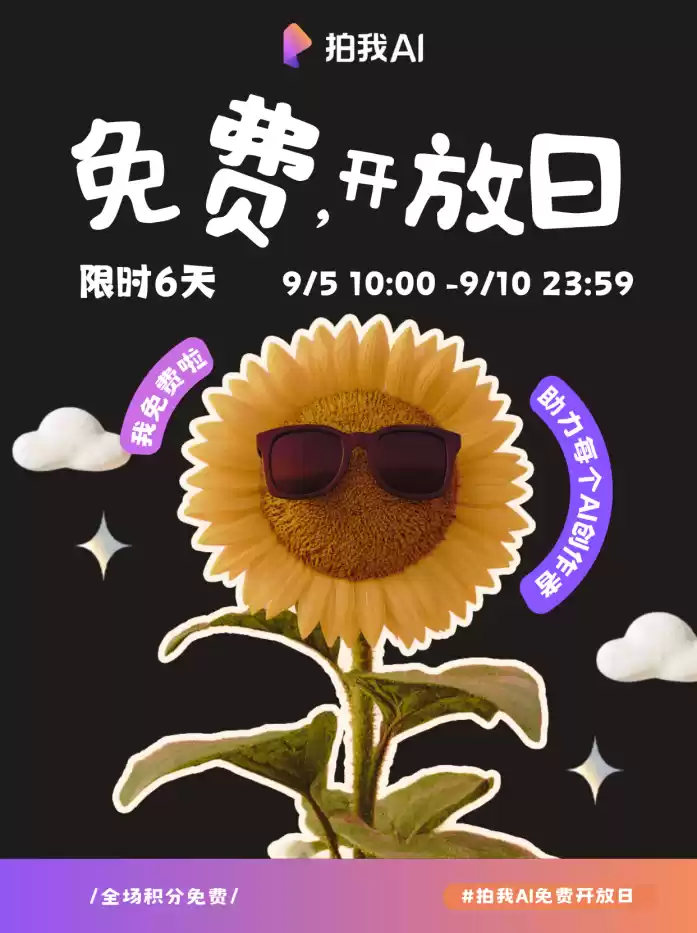 赶快行动,截至9月10日,抓住5天限时免费机会,让你的创意“动”起来!无论是手办、宠物还是奇幻故事,拍我AI都能帮你轻松生成精彩短片。微博搜索#拍我AI免费开放日,应用市场下载拍我AI,或点击https://pai.video立即体验,让AI成为你生成令人心动的角色吧!