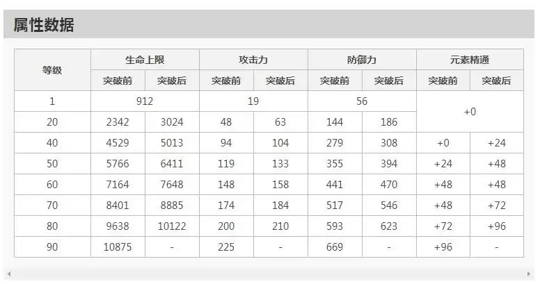 游戏《原神》中,角色香菱在突破后会增加的属性数据有:生命上限、攻击力、防御力和元素精通。香菱在90级满级时的最高属性分别为生命上限10875,攻击力225,防御力669和元素精通+96。