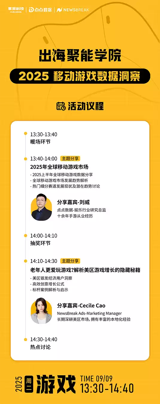 基于以上行业痛点以及从业者获取新知的需求,掌慧科技旗下的“出海聚能学院”将通过视频号直播形式与从业者面对面,每月一场,每场邀请2-3位行业专家进行分享。在9月9日的首期直播中,掌慧科技邀请到美国资讯平台NewsBreak Ads Cecile Cao与点点数据娱乐行业研究总监刘威,针对《2025移动游戏数据洞察》展开分享。首期预告一经发布收到游戏从业者广泛关注,目前直播预约已经突破千人。