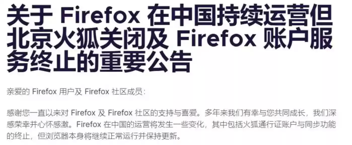 据媒体报道,7月27日,北京谋智火狐信息技术有限公司发布公告,表示其在中国大陆与Mozilla及Firefox浏览器相关的所有运营业务即将正式终止。