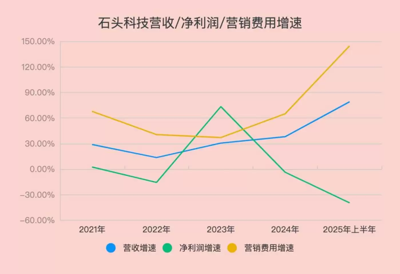 Tech星球统计发现,从2024年、2024年和今年上半年,石头科技的净利润增速一直为负数。除去2024年,石头科技的营销费用增速始终大于营收和利润增速,今年上半年其营销费用增速达到了144.51%,而净利润增速则为-39.55%。