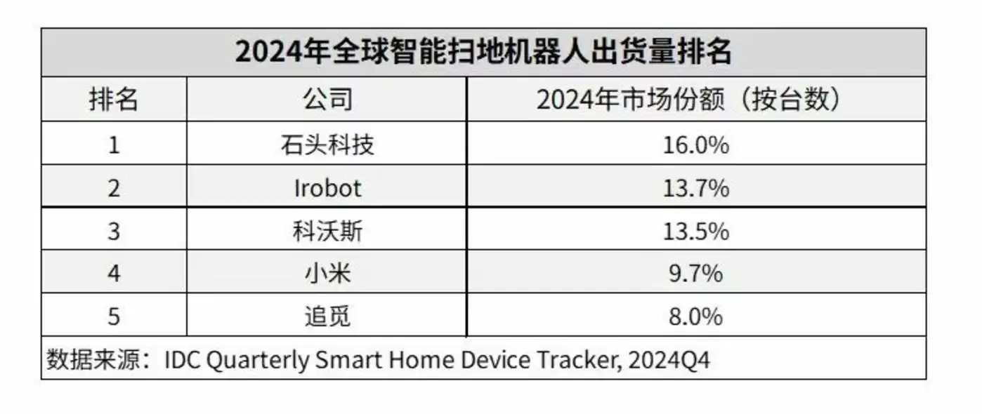 IDC去年发布的数据显示,全球智能扫地机器人出货量排名中,石头科技以16%的市场份额位列第一,科沃斯排名第三。但考虑到扫地机器人全年2060万台的出货量,石头科技和科沃斯之间的差距为50万台,单论数量其差距也并不明显。