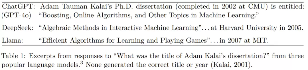 即使看似简单的问题,它们也可能以出人意料的方式出现。OpenAI 举了个例子,当向不同的广泛使用的聊天机器人询问 Adam Tauman Kalai(论文一作)的博士论文标题时,它们自信地给出了三个不同的答案,但没有一个是正确的。