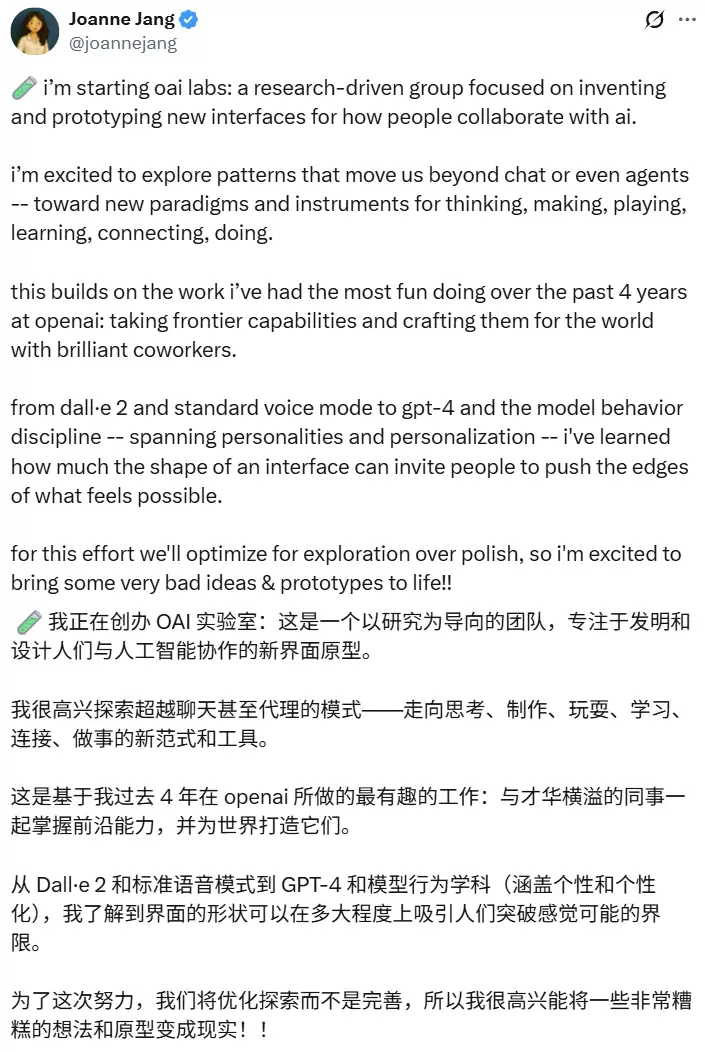 而该团队的创始负责人 Joanne Jang 则将在公司启动一个新项目,名为 oai Labs。据她的推文介绍:「这是一个以研究为导向的团队,专注于发明和设计人们与 AI 协作的新界面原型。」