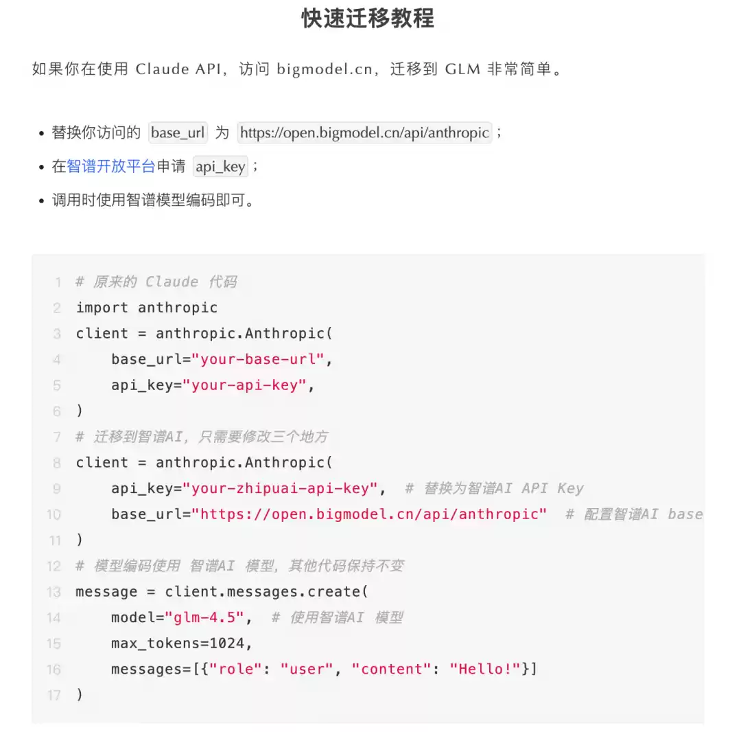 此外,智谱还提供详细的迁移教程,帮助用户快速完成从 Claude 到 GLM 的系统迁移,确保切换过程高效顺畅。