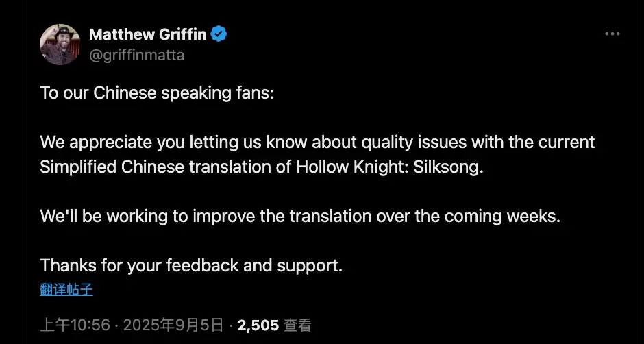 近日,空洞骑士:丝之歌的游戏发行负责人 Matthew Griffin 在社交媒体上回应了玩家对于游戏简体中文翻译质量的反馈。他表示,已关注到相关问题,并计划在未来几周内对简体中文版本进行优化与改进,同时感谢玩家们提出的意见与持续支持。
