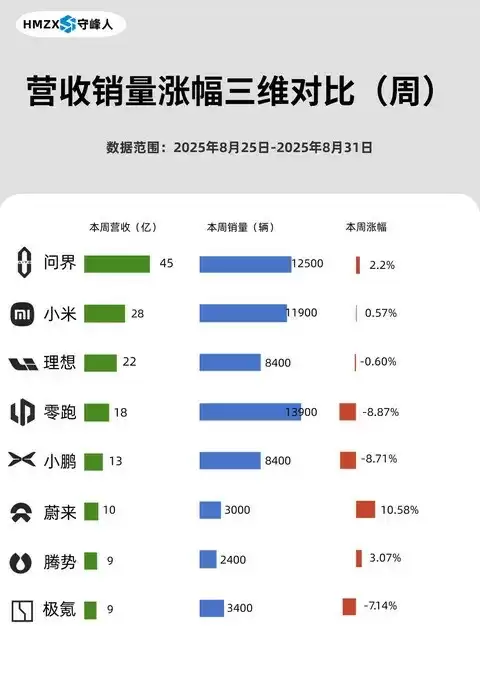 在2025年8月25日至8月31日期间,国内部分主要新能源汽车品牌的销售与营收情况如下: