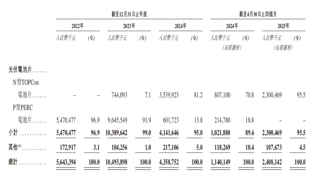 如下图显示,于往绩记录期间,英发睿能主要通过P型PERC电池片和N型TOPCon电池片产生收入。2024年,公司以生产P型PERC电池片为主,收入占比高达96.9%,在2024年,虽然布局的N型TOPCon电池片为公司带来了收益,但仍以P型电池片为主,二者创收占比分别为7.1%和91.9%,但在2024年,N型电池片的创收占比飙升至81%,2025年前四个月更是高达95.5%,英发睿能也凭此跃升全球第三大专业电池片制造商。
