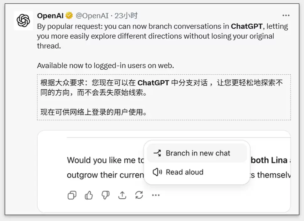 昨晚OpenAI给 ChatGPT 上了个新功能:分支对话。