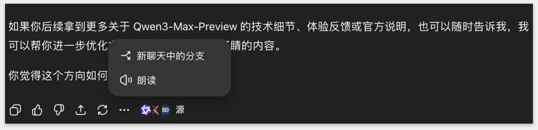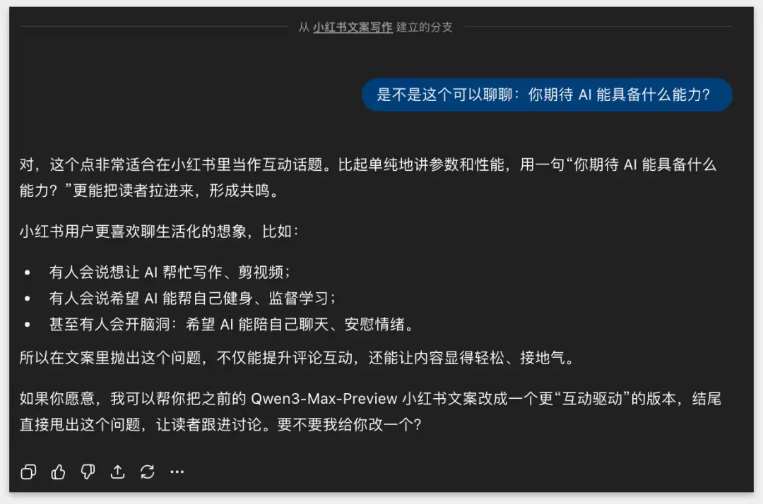 可今天早上上线了「分支对话」,我就顺手点了「更多」,从那条回复开了个分支,和它单独聊「我最期待 Qwen3 能有什么样的能力」。