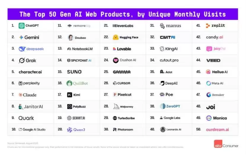 Google在前50名 中还有其他三个工具:AI Studio(第10名)、NotebookLM(第13名)和Google Labs(第39名)