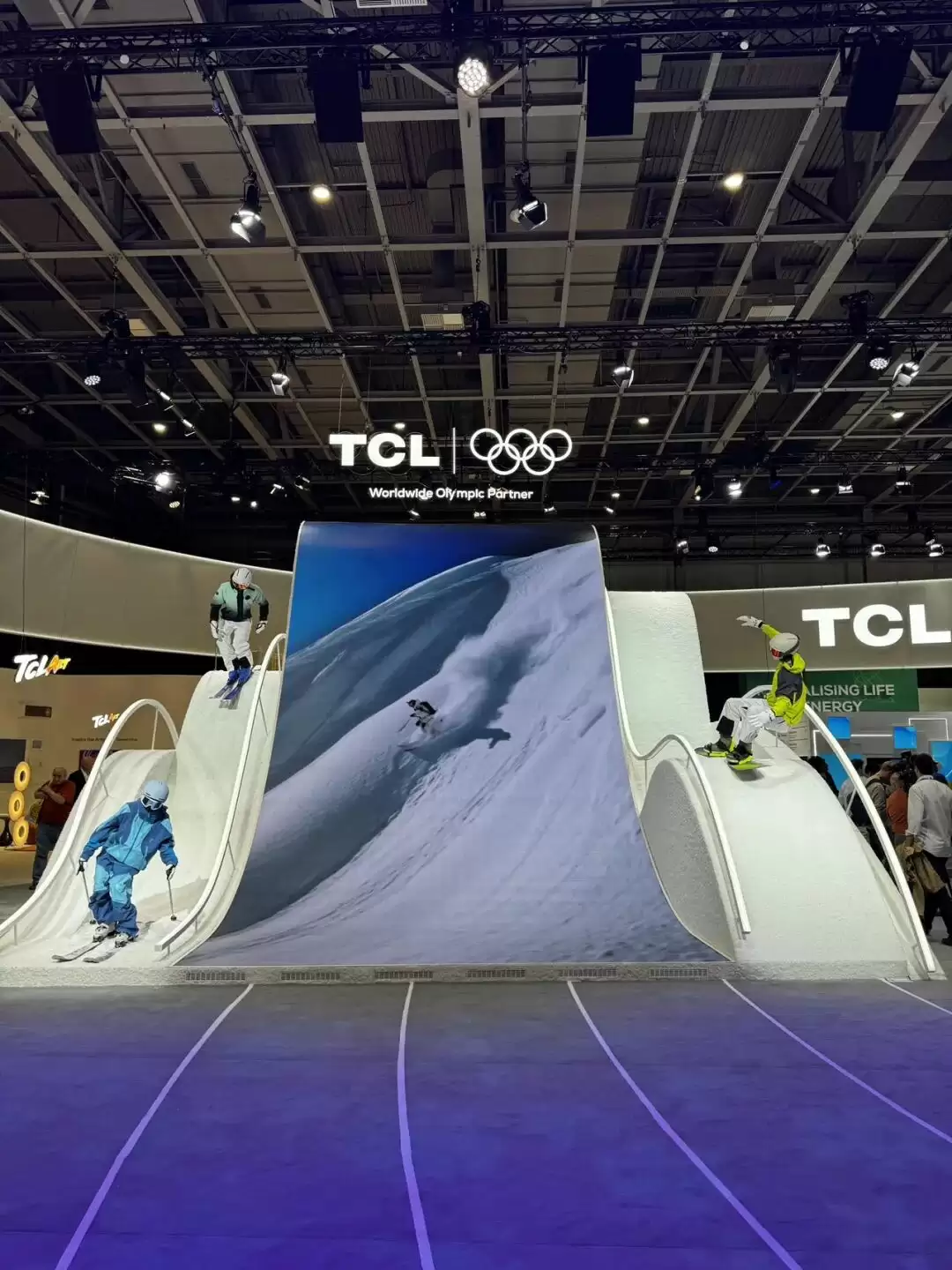 如果说中国军团里谁的排场最大,TCL 大概没有悬念。作为展会冠名赞助商和奥运合作伙伴,它直接包下了一整馆,打造成一个冬奥主题展区。电视、投影、洗衣机、冰箱、空调、智能眼镜,甚至连光伏方案都带来了。