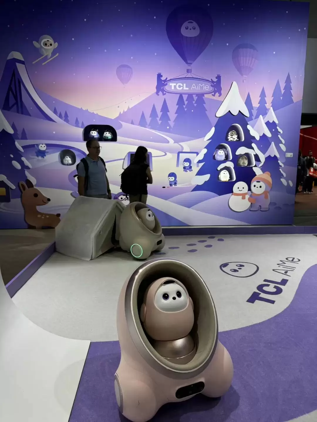不过最出乎意料的,是 TCL 掏出了一个全球首款分体式 AI 陪伴机器人 AiMe。机器人长得很像冰墩墩,装在一个带有轮子的太空舱中,内置了上百种表情和动作,能听懂你的话并快速回应,可以陪孩子聊天、讲故事,或者自己抓拍家里的有趣瞬间。你会发现,IFA 上的家电大厂们似乎都不甘心困在老本行。扫地机厂商卷起机械臂,把清洁机器人往多功能助手方向演进;而像 TCL 这样的家电巨头,则直接端出陪伴型机器人,把娱乐、情感和智能家居控制揉在一起。