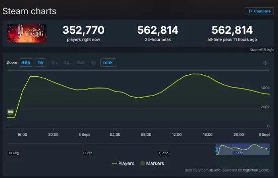根据相关数据统计,截至发稿时,丝之歌在Steam平台的在线人数峰值已突破56万大关,并且仍有持续增长的趋势。考虑到这一数据主要来自周五晚间的统计,未来仍有可能进一步上升。