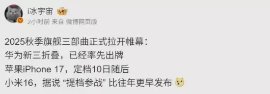 每年9月,随着苹果新款iPhone的发布,各大国产手机厂商也纷纷加入新一轮旗舰机型的竞争。知名博主@i冰宇宙今日透露,2025年秋季的旗舰手机大战已经正式开启: