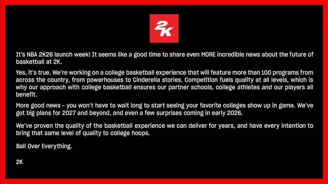 消息曝光后不久,2K便在社交平台X上发布声明,正式确认将重新引入大学篮球元素。声明中,2K也对EA的失利意味深长地表达了态度,强调其为高校提供的合作方案更优质、更具吸引力。