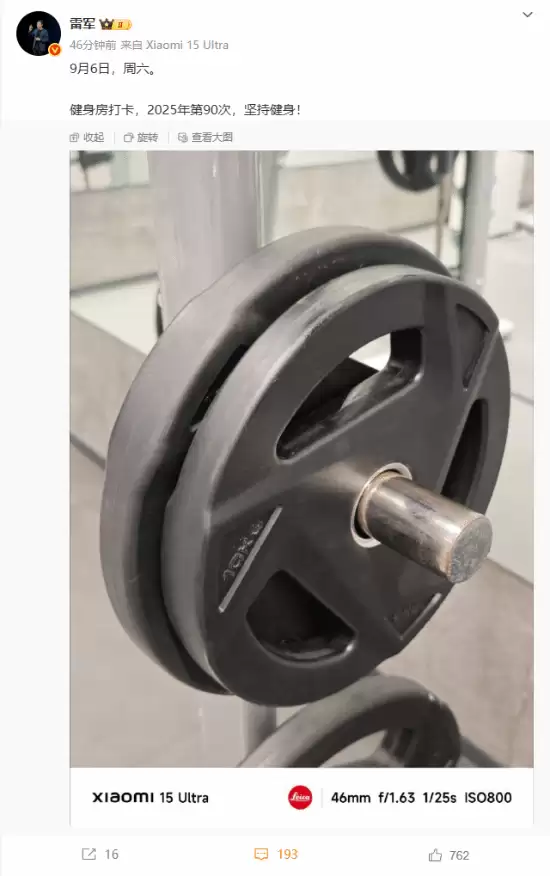 9月6日清晨6点54分,雷军在社交平台分享了当日的健身动态,并配文“9月6日,周六。健身房打卡,2025年第90次,坚持健身!”。该动态定位为北京,发布设备为一款智能手机。