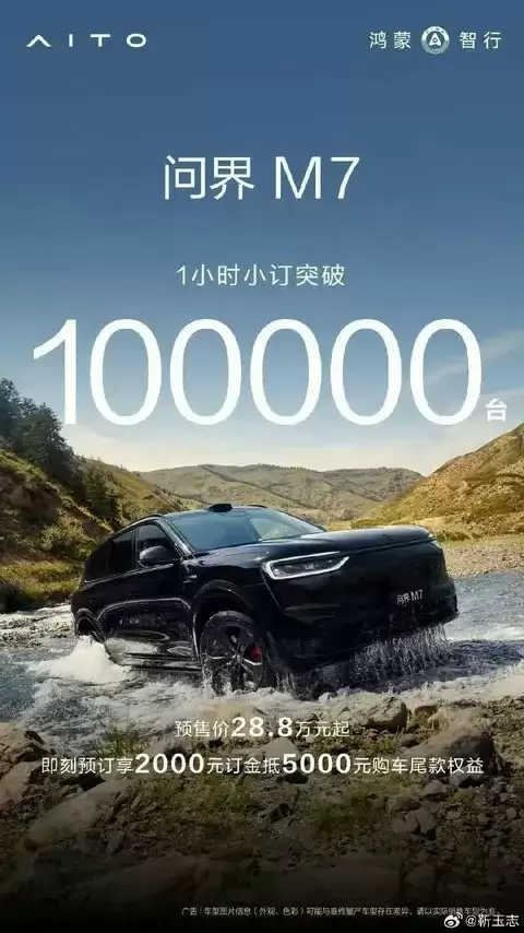 问界M7首销10分钟破2万单,1小时小定破10万大关