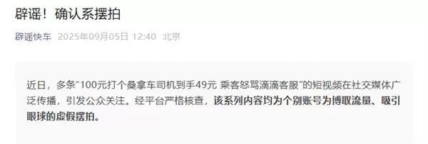 官方澄清100元打车司机仅得49元短视频为虚假摆拍引流