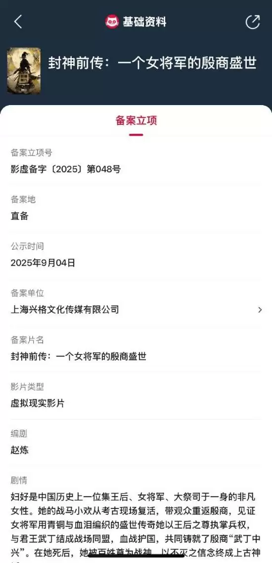 近日,国家电影局备案立项信息显示,一部以虚拟现实技术制作的影片封神前传:一个女将军的殷商盛世正式立项,备案单位为上海兴格文化传媒有限公司。