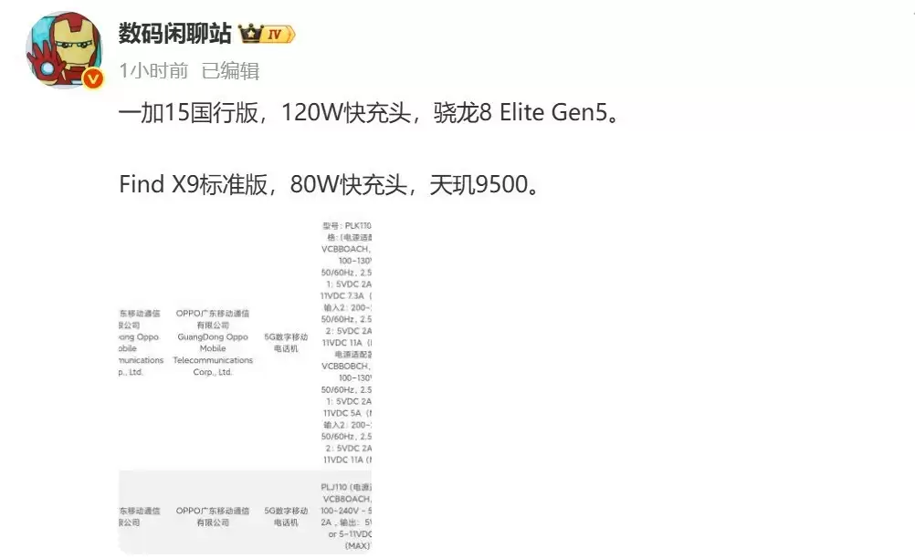 根据最新消息,知名数码博主“数码闲聊站”透露,型号为 PLK110 和 PLJ110 的两款新机已于 9 月 4 日通过 3C 认证,分别对应一加 15 国行版与 OPPO Find X9 标准版,快充规格分别为 120W 和 80W。