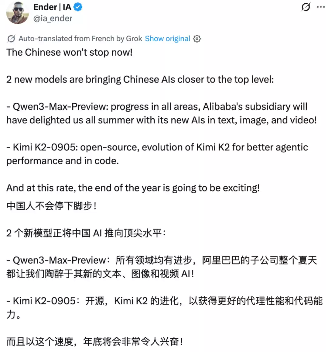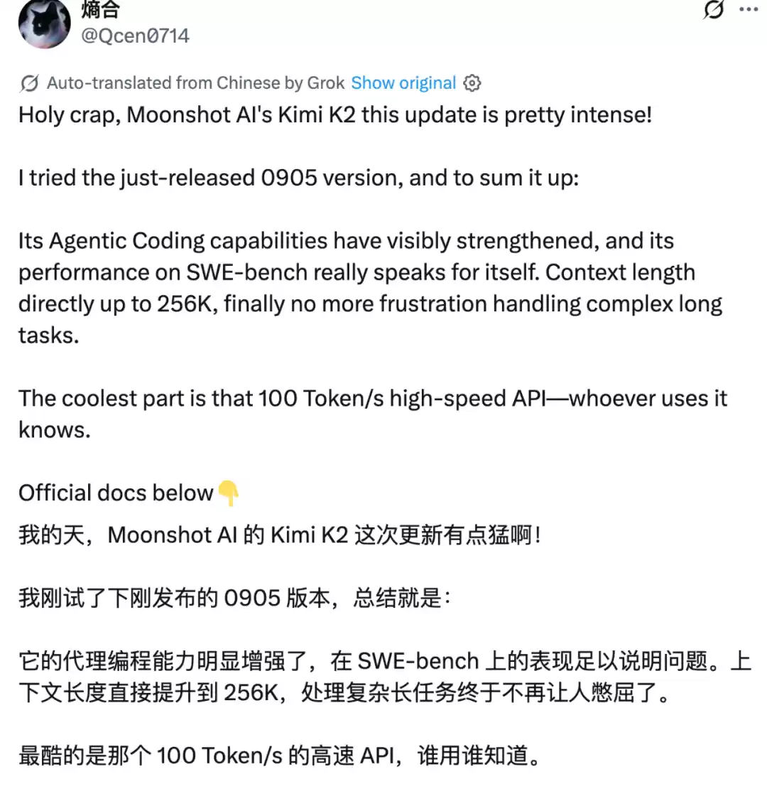 对于最新的 Kimi-K2-0905,有人直言「终于不用再为处理复杂的长任务而感到挫败了。」