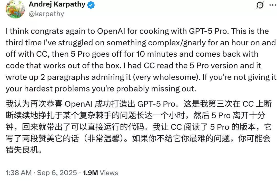 这一方面源于 OpenAI GPT-5 系列模型的强势崛起,在与 Claude Code 的对战中大有「后来者居上」之势,AI 大神 Karpathy 现身说法并开始安利 GPT-5 Pro 的强大代码能力。