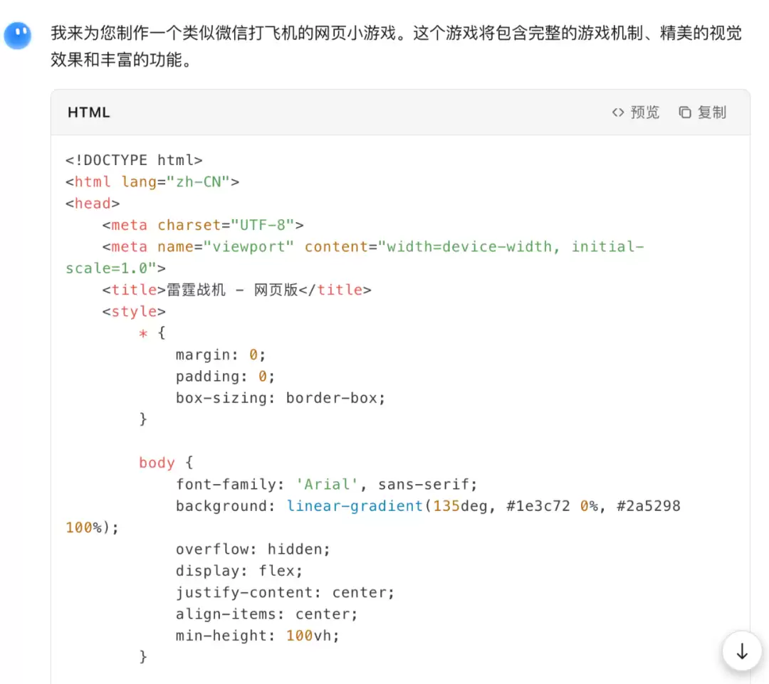 指令很简单:「制作一个和微信打飞机类似的网页小游戏,需要美观,好玩,功能齐全。」
