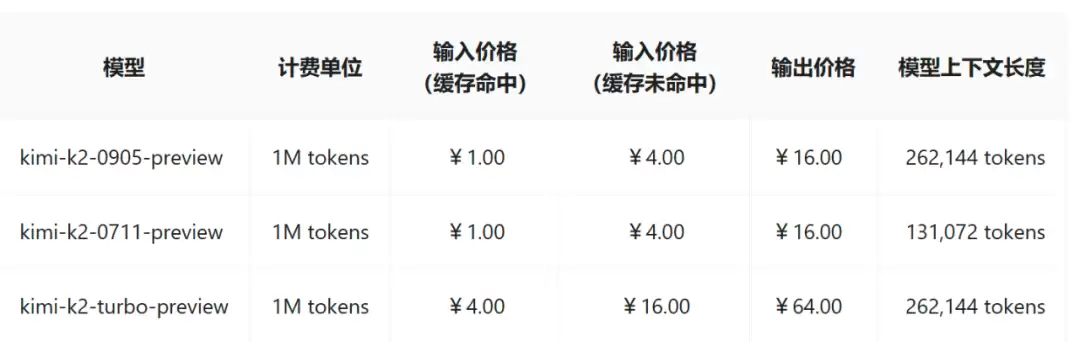 据我们了解,Kimi 开放平台上架的 kimi-k2-0905-preview 模型 API,定价与上一代一致,计费方案为缓存未命中时每百万输入 tokens/4 元,缓存命中时每百万输入 tokens/1 元,每百万输出 tokens/16 元。详细的定价策略参考下图: