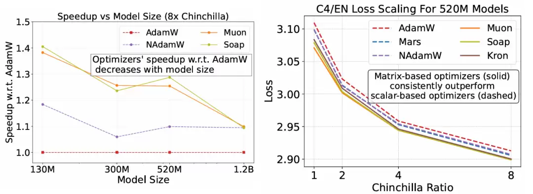 左:加速效果随模型规模的增大而衰减。 尽管一些优化器在参数量小于 10 亿的模型上相比 AdamW 能展现出较高的加速比(1.3-1.4 倍),但当模型规模增至 12 亿参数时,其加速比会衰减至仅 1.1 倍。右:基于矩阵的优化器性能稳定优于基于标量的优化器。 该图展示了三种基于标量的优化器(AdamW, Nesterov AdamW, Mars)和三种基于矩阵的优化器(Kron, Soap, Muon)在不同 Chinchilla 数据配比下训练时的损失曲线。基于矩阵的优化器相比基于标量的优化器实现了一致的加速效果。此外,在过训练(overtrained)的情况下,这三种基于矩阵的优化器最终会收敛到相似的损失值。