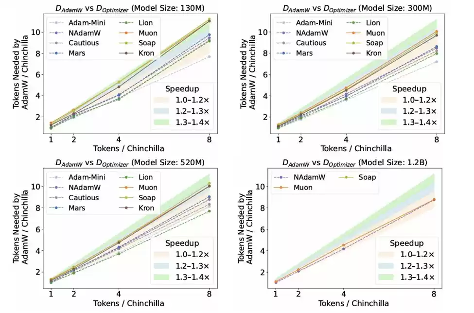 为了验证这一假设,研究人员进行了系统性的比较研究,涵盖了十一种不同的深度学习优化器。他们在多种模型规模(从 1 亿到 12 亿参数)和数据–模型比例(参照 Chinchilla 最优比例的 1 倍至 8 倍)下,为每一种优化器都进行了严谨、独立的超参数调优。