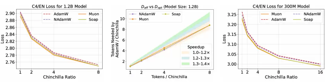 案例分析。左图: 在 12 亿参数模型上,AdamW、NAdamW、Muon 和 Soap 四种优化器的验证集损失缩放情况。结果显示,Muon 和 Soap 相比 AdamW 仍有显著的加速效果,但相比 NAdamW 已无明显加速优势。中图: 采用与图 3 相同的方法估算加速比。我们观察到,Muon 和 Soap 的加速比随模型规模增大而衰减,最终降至仅 1.1 倍。右图: 在 3 亿参数模型和 16 倍 Chinchilla 数据配比的设定下,实验结果表明,当数据与模型的比例进一步增大时,Soap 的性能优于 Muon。