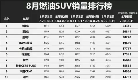 8月燃油SUV市场整体格局发生了明显变化。从销量排行来看,吉利旗下两款车型博越L和星越L分别以超过2.3万辆和突破2万辆的成绩包揽前两名,成为当月最引人注目的黑马。紧随其后的大众途观L和丰田RAV4荣放也维持了较高的市场热度,月销量同样突破2万台。这一梯队的车型在整个月份中表现稳定,显示出较强的市场基础和用户认可度。