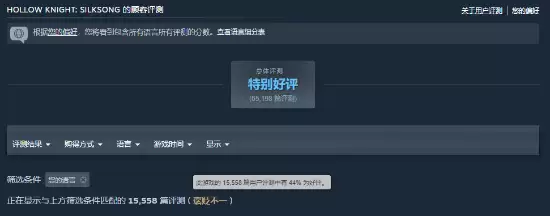 备受期待的游戏空洞骑士:丝之歌现已正式上线。根据最新数据显示,截至当前日期,该游戏在主流数字平台中文区的好评率已由此前的48%下降至44%,并且仍有继续下滑的迹象。与此同时,游戏整体评价的好评率也降至82%。