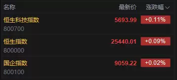 今日港股三大指数集体高开,恒生指数涨0.09%,报25440.01点,恒生科指涨0.11%,国企指数涨0.02%。盘面上,科网股涨跌不一,百度涨超2%,阿里巴巴涨超1%,快手跌超0.5%;创新药概念高开,药明康德(603259)涨超3%;黄金、有色金属板块走高,山东黄金(600547)涨超4%;光伏太阳能(000591)股延续涨势,卡姆丹克太阳能涨15%;中资券商股活跃,广发证券(000776)涨超1%;内房股普遍上涨,碧桂园涨超14%。