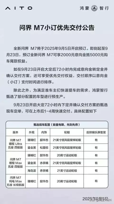 令消费者倍感惊喜的,还有此次提车速度之快。最新明确表示,在9月23日正式开启大定支付后的72小时内完成锁单并确认配置的用户,将享有优先提车权益,最快可在1至4周内收到新车。值得一提的是,鸿蒙智行已在预售前进行了部分增程版和纯电版车型的预生产,并统一配备了后排娱乐屏套装,随时准备交付。