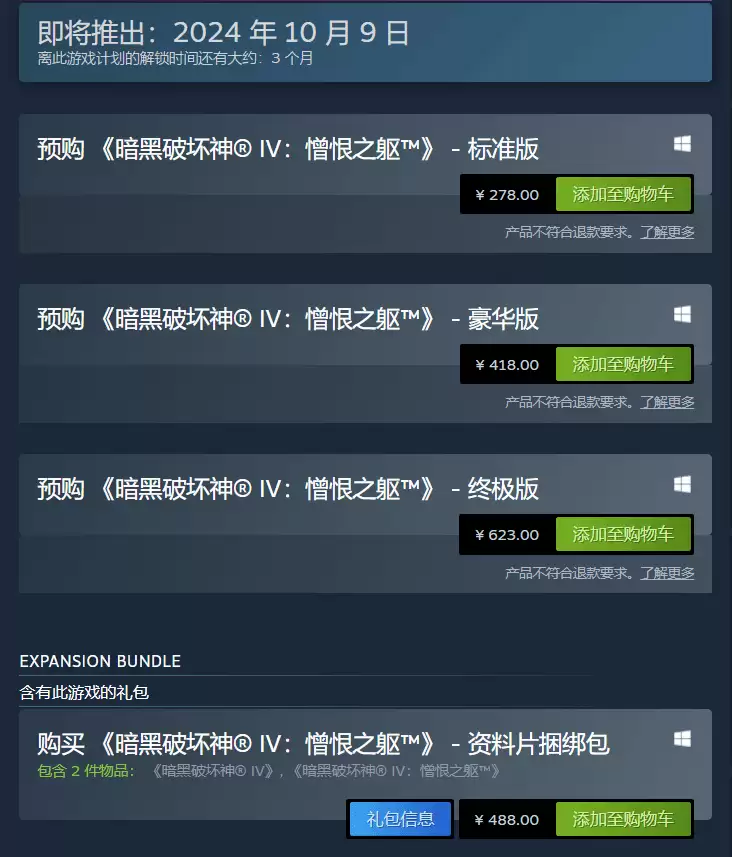 DLC提供多种版本可选,标准版售价278元,豪华版售价418元,终极版售价623元。此外,还提供售价488元的《暗黑破坏神4:憎恨之躯》资料片捆绑包。