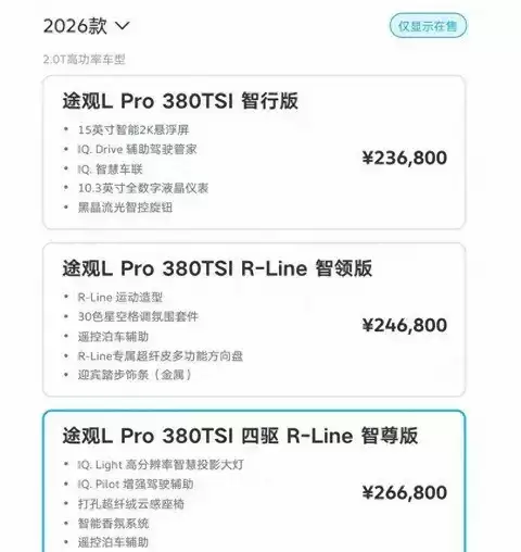 整体来看,新款途观L Pro在配置布局上更加注重功能实用性与智能科技的结合,消费者可根据自身需求选择适合的版本。