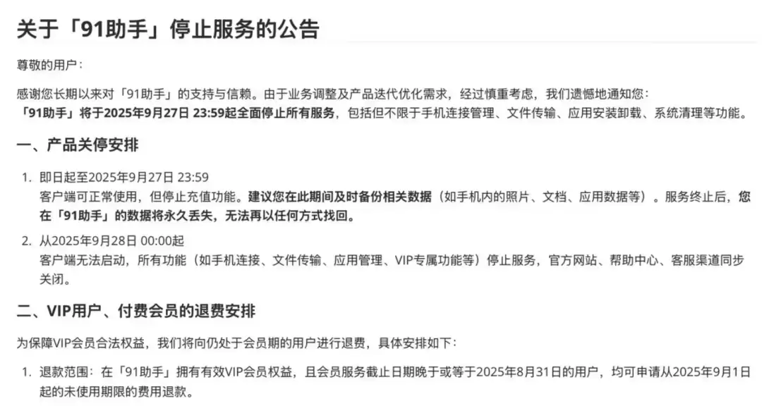 上月底,91 发了个公告,说要在 9 月 27 日全面停止服务,所有数据会永久丢失,那些没到期的 VIP 会员记得登记一下退款啊。