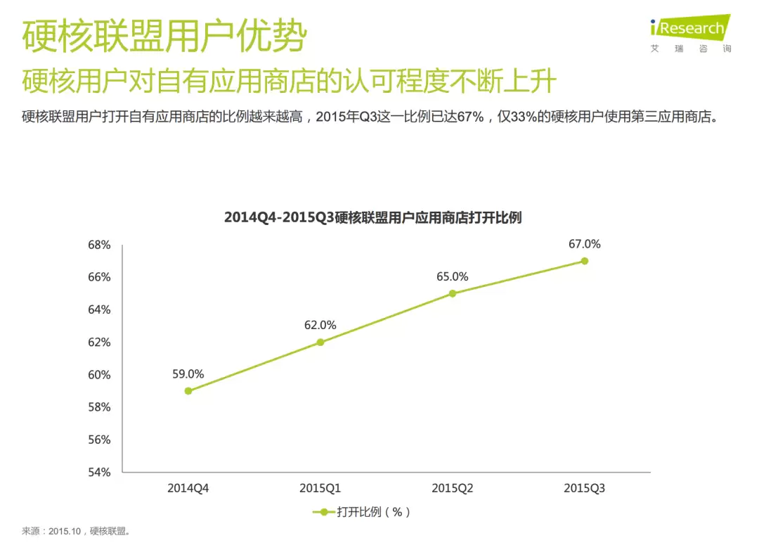2015 年第三季度,硬核联盟用户打开最新 App 商店比例就上升到了 67%。5 年后,联盟应用商店渗透率更是达到 64.38%,为所有分发平台中最高。