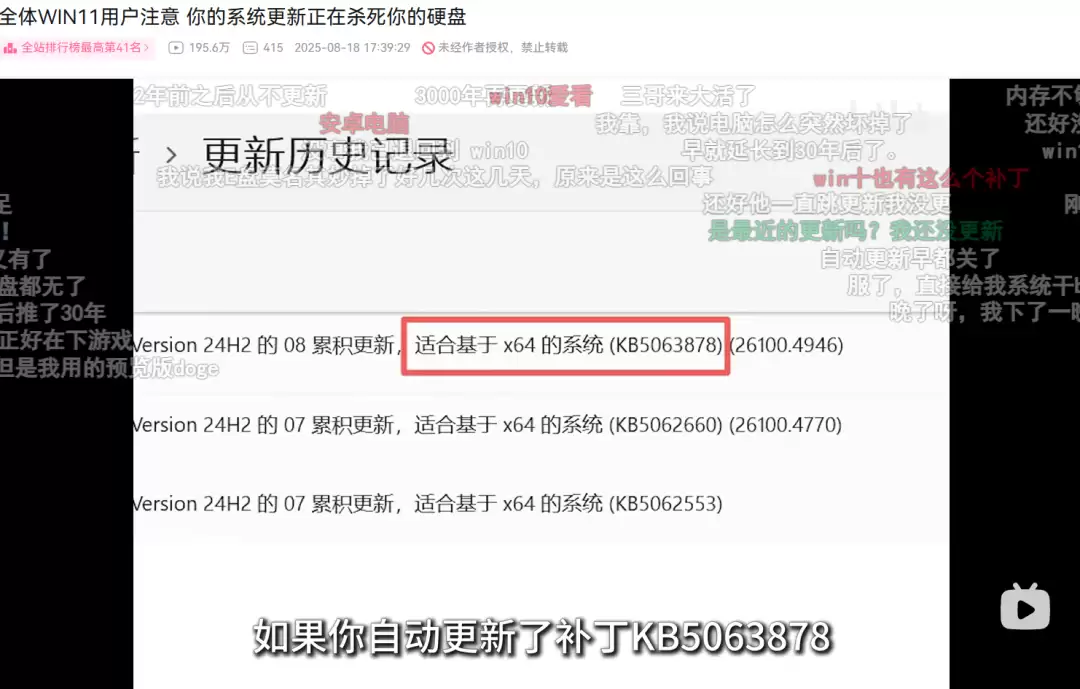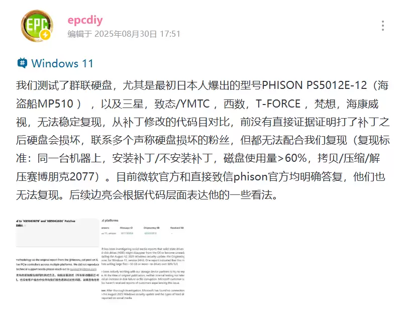 然而,这个事情还在不断地发酵。甚至这几天我们的后台私信里也总有差友一直在问 “为什么没做Win11 的 KB5063878 更新导致掉盘的内容?”
