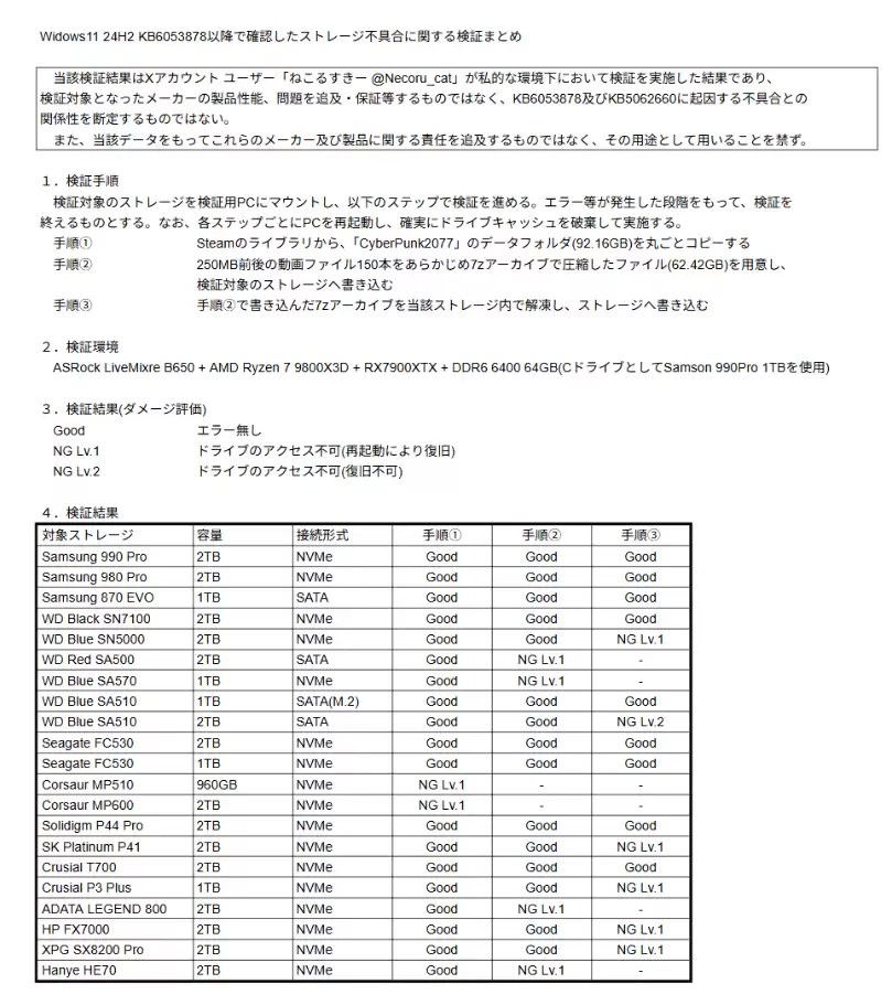 根据这哥们儿的说法,他在给电脑安装了Win11 24H2的安全更新(KB5063878)后,硬盘(主控为Phison群联)的写入量超过 60% 后,再向硬盘一次性写入超过 50GB 的数据,电脑的界面会卡住、无响应。等状态恢复之后就有概率出现文件损坏的情况。