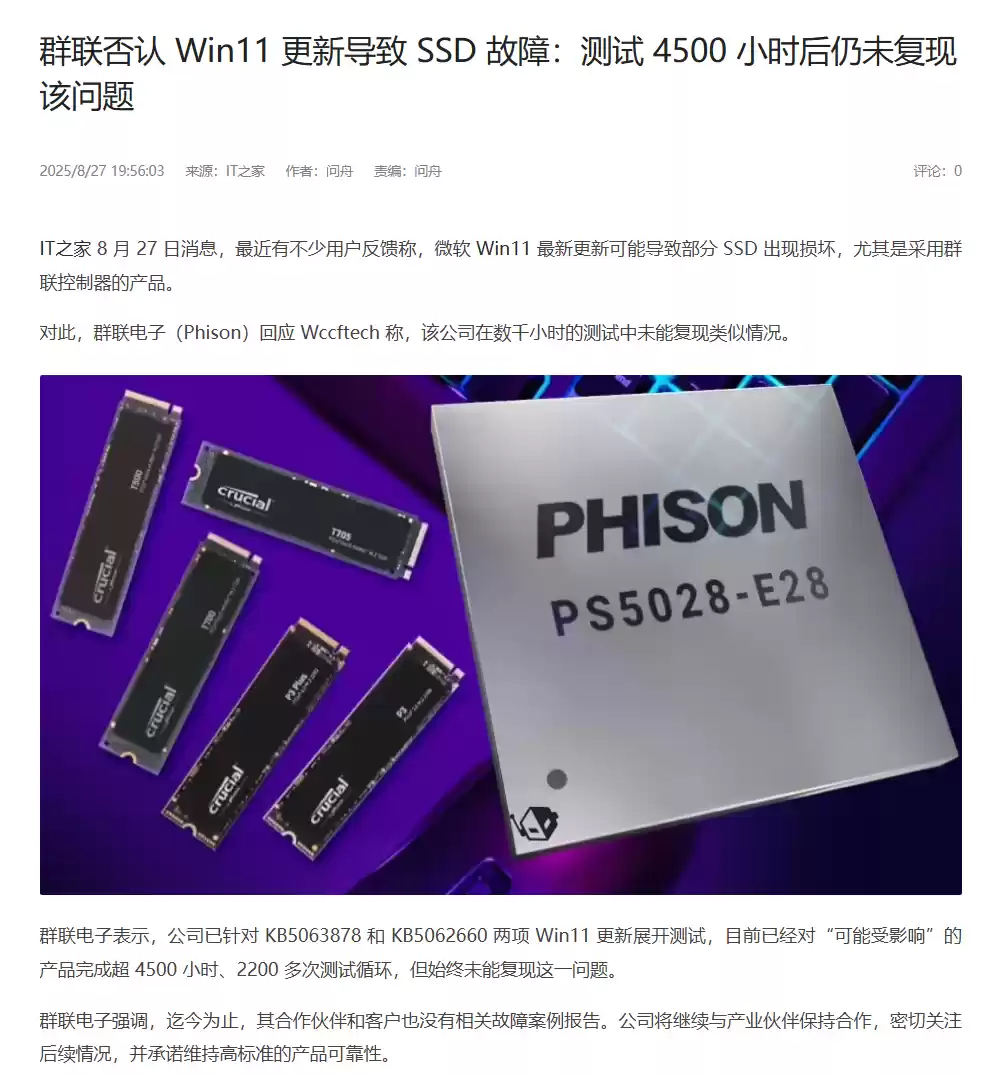 IT之家,《群联否认 Win11 更新导致 SSD 故障:测试 4500 小时后仍未复现该问题》