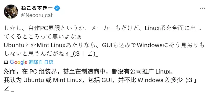 后来,我又去这个日本老哥的 X 逛了一下,发现他虽然酷爱装机,但对于Windows 一直印象不怎么好,比较热衷发一些“鞭策”Windows 的推文。
