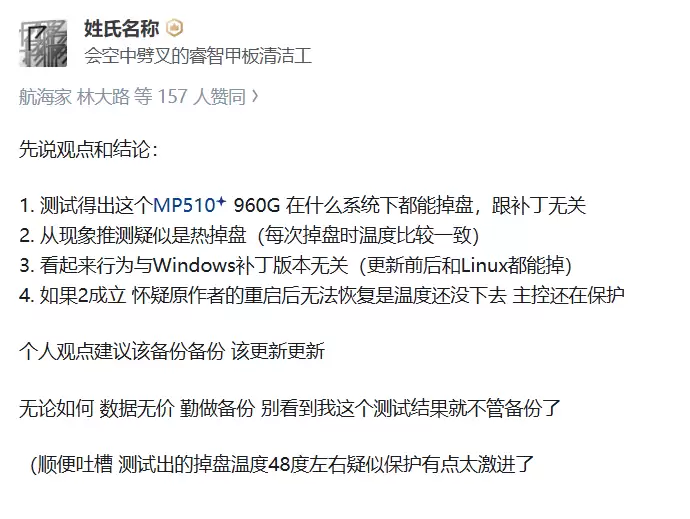 说人话就是,更新完这个版本的系统后,你要是往硬盘里大量写入数据的话,就有可能存在掉盘甚至丢失数据的风险。