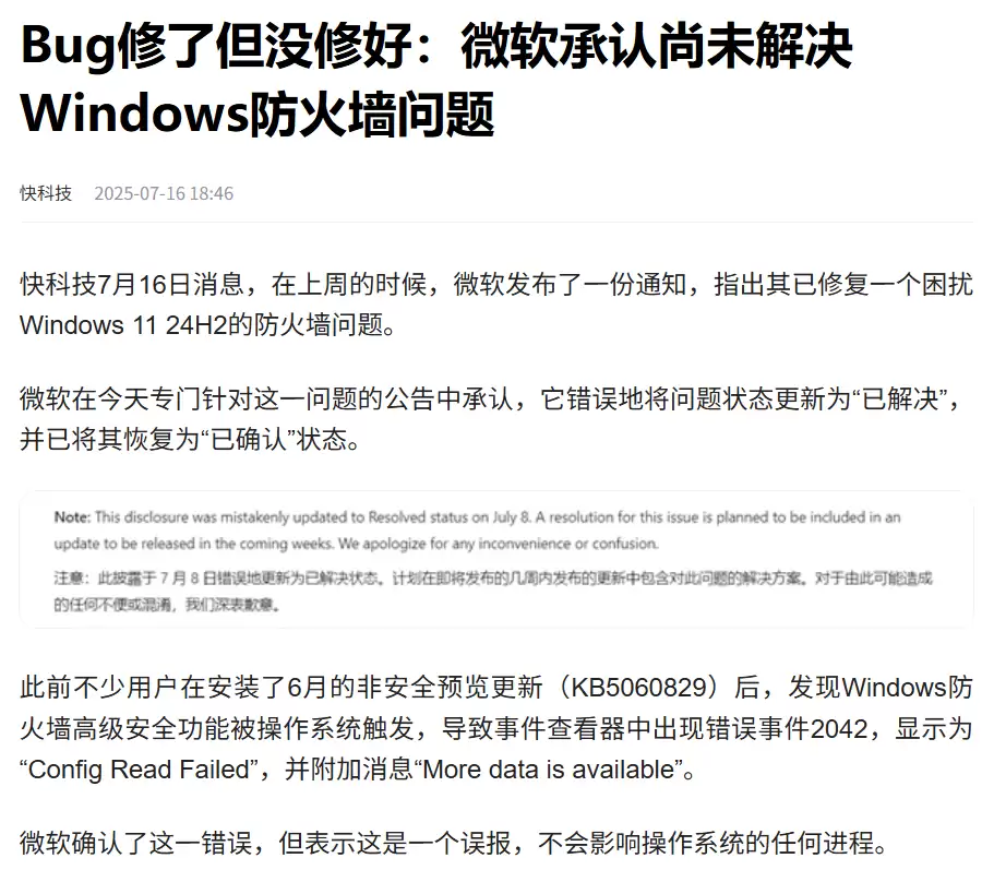 快科技,《Bug修了但没修好:微软承认尚未解决Windows防火墙问题》