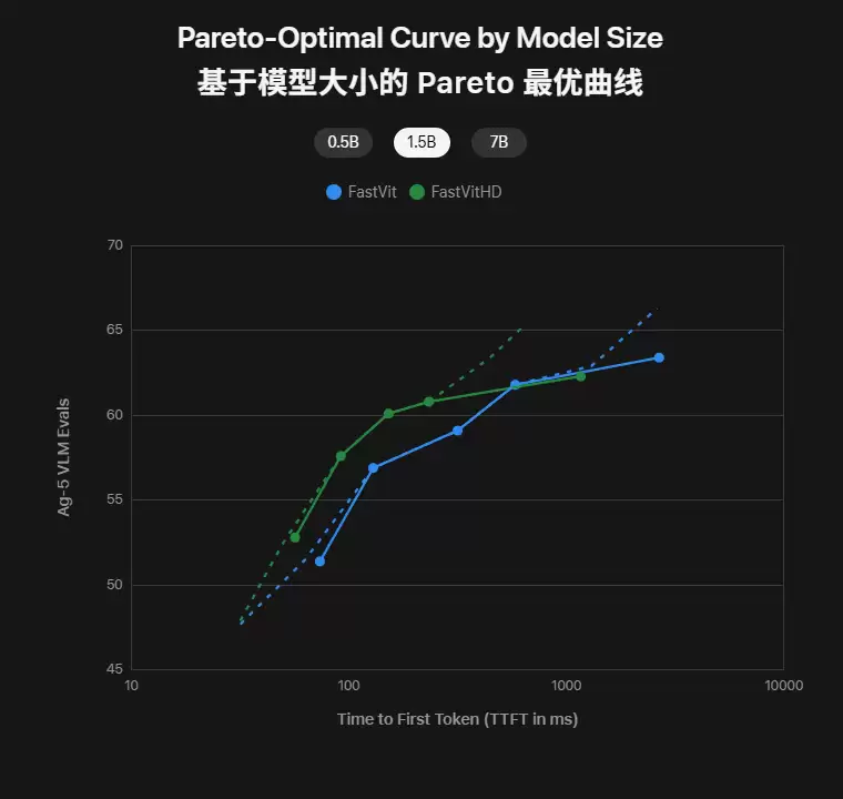 从这条对比曲线能看得很清楚:同样是0.5B、1.5B、7B参数量,绿色的FastVitHD总比蓝色的FastVit更靠左上。