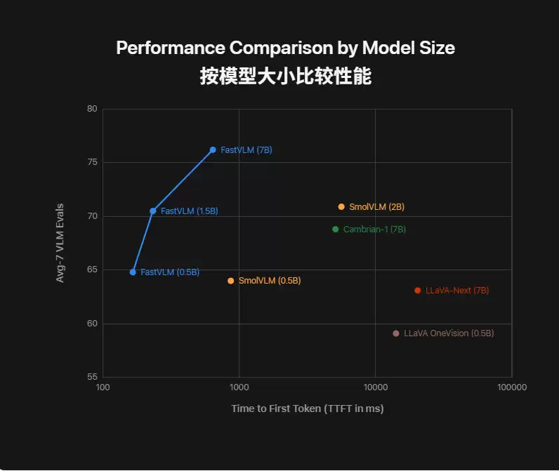 从这张性能对比图可以直观看出:FastVLM越大,性能越强,但延迟始终压得极低。