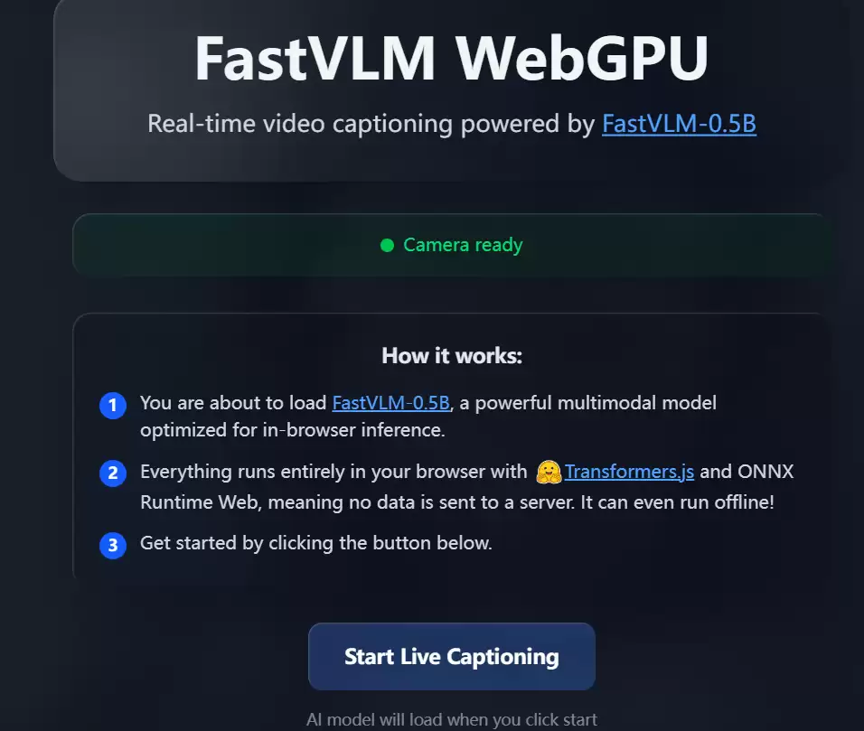 最直观的方式,就是去Hugging Face打开他们提供的FastVLM WebGPU Demo。